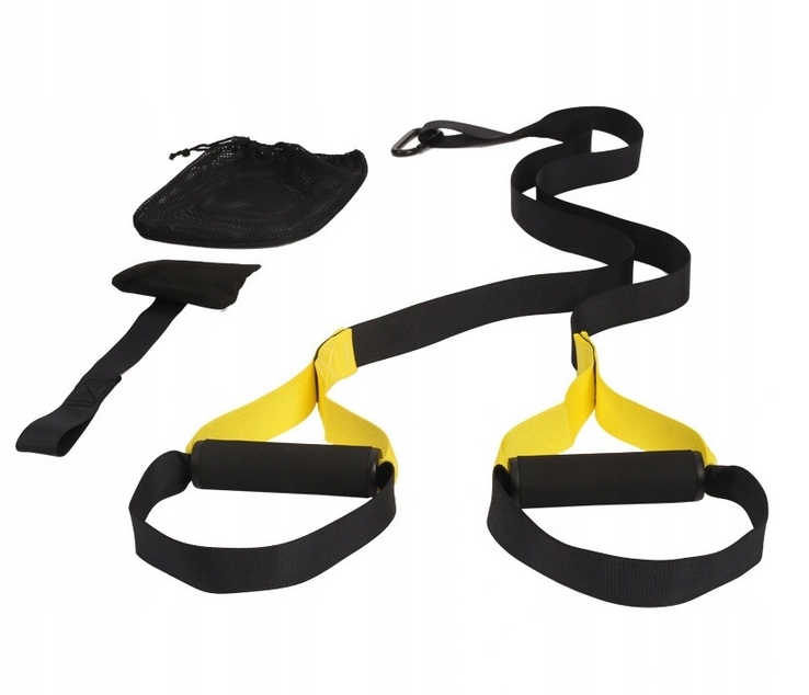 Zestaw składa się z taśm treningowych bez regulacji o długości 110cm zakończonych uchwytami i karabińczykiem, specjalnego uchwytu do montażu na drzwiach oraz torby do przechowywania.