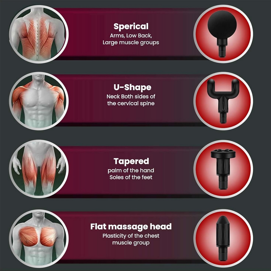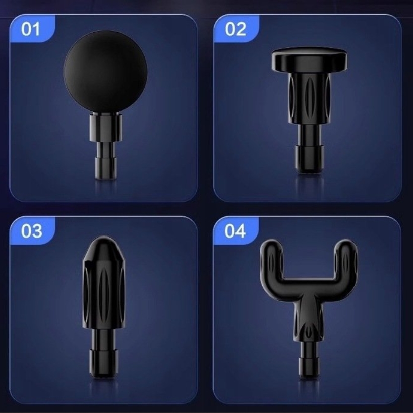Oprócz pistoletu do masażu w zestawie znajdują się 4 wymienne głowice do masażu, za pomocą których można masować lub odprężyć każdą część ciała.