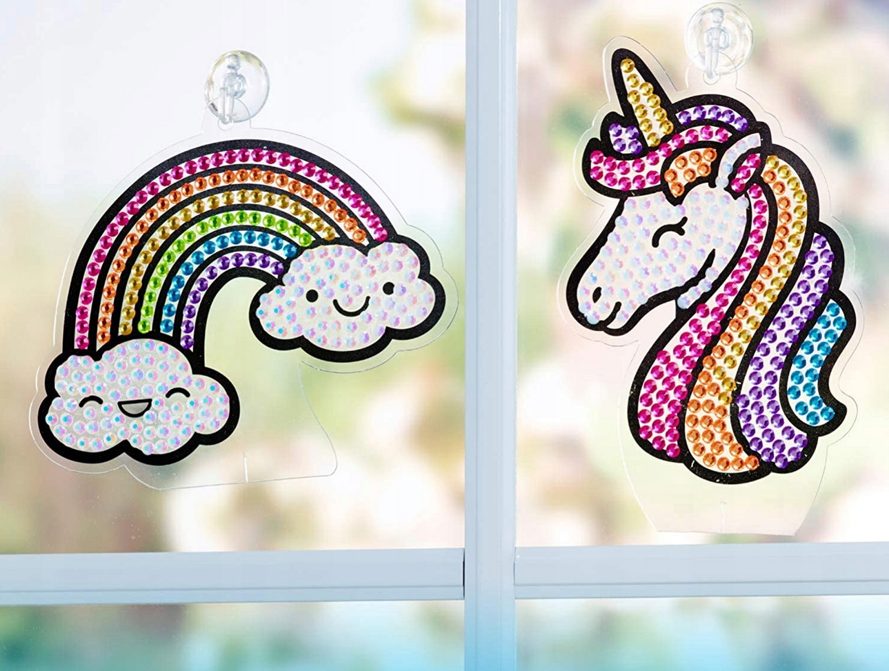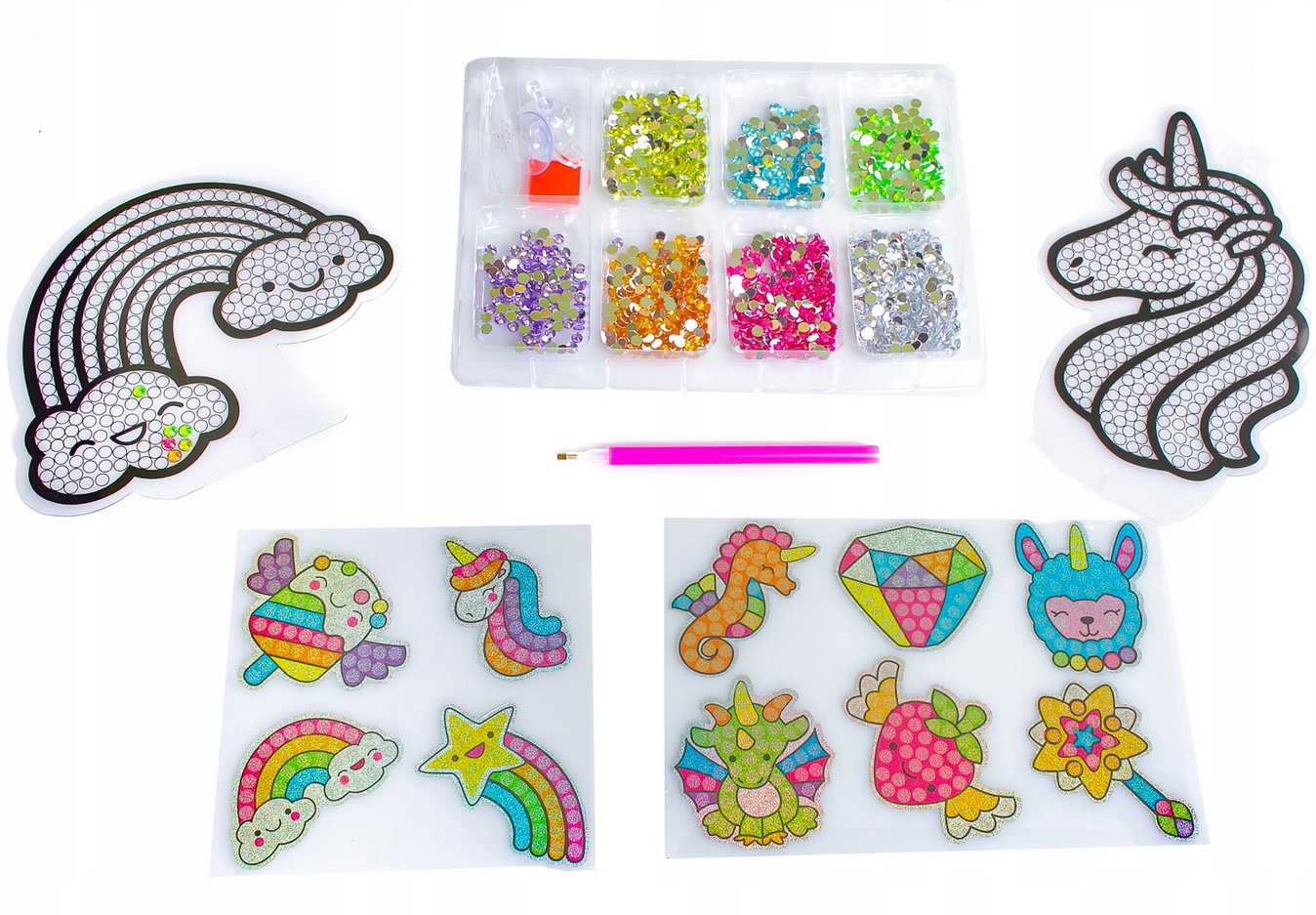 Zestaw pozwala na wykonanie mieniących się w słońcu ozdób na okno, biurko, zeszyt lub plecak.
