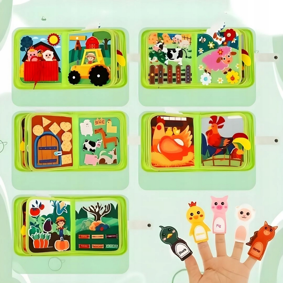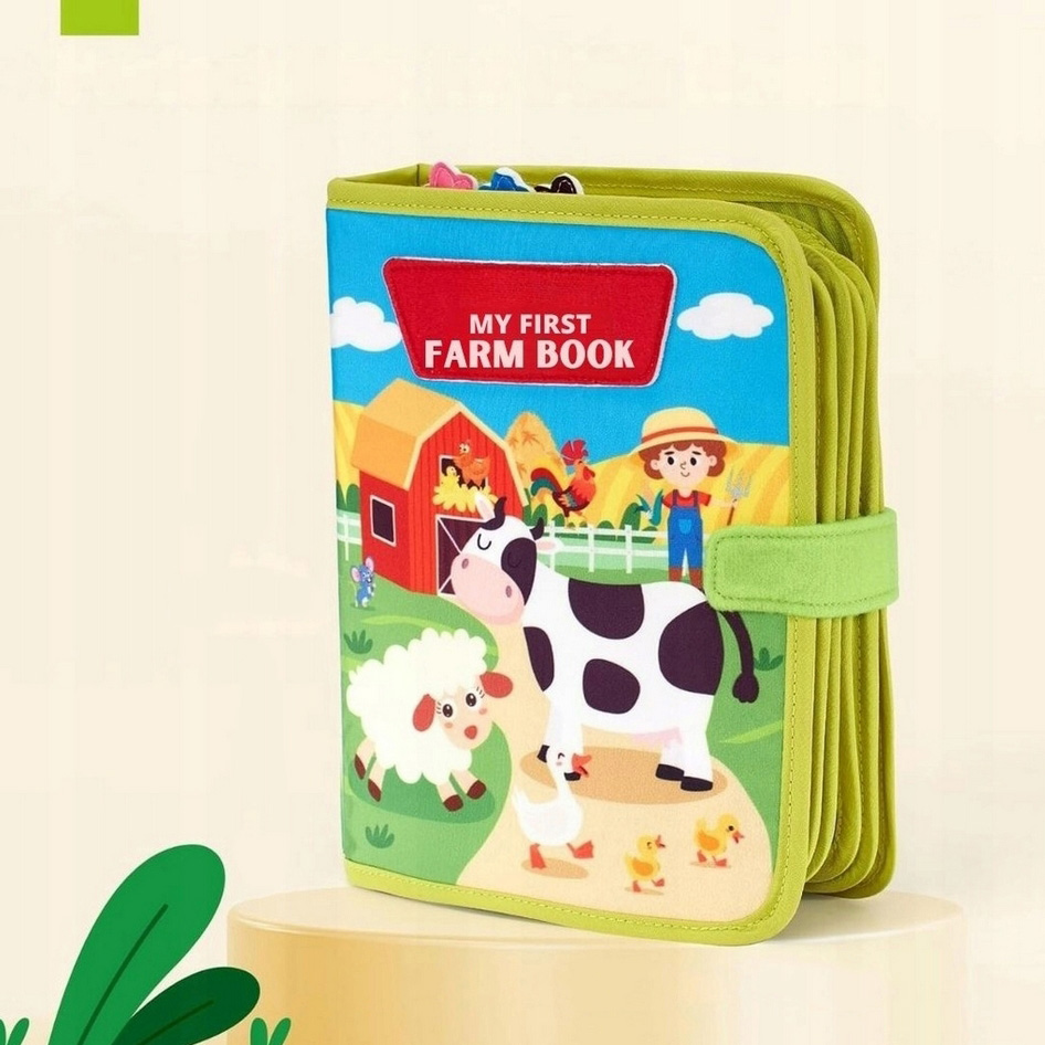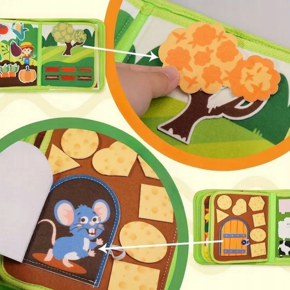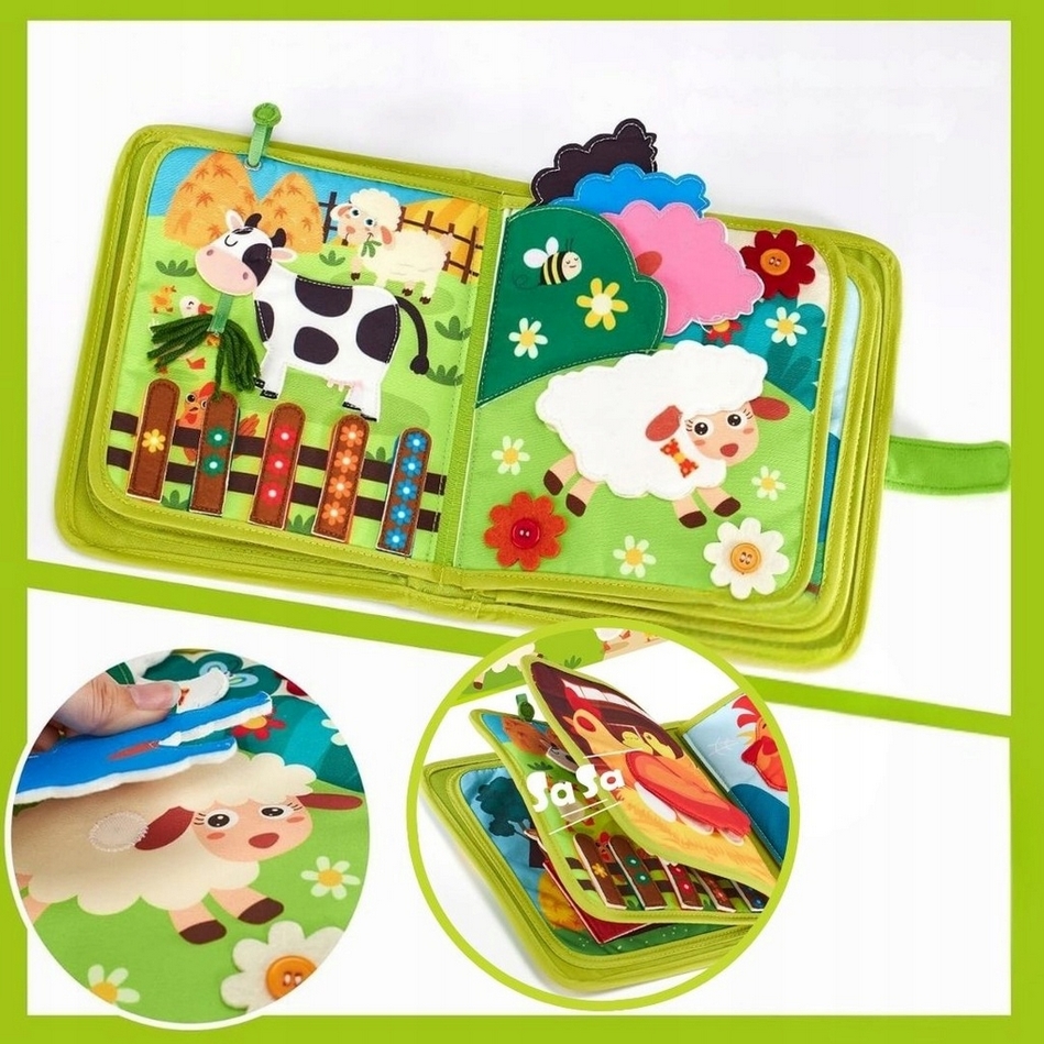 Zawiera 10 stron różnorodnych aktywności, w tym rzepy, guziki, sznurki i ruchome elementy sensoryczne, które wspierają rozwój koordynacji ręka–oko oraz małej motoryki.