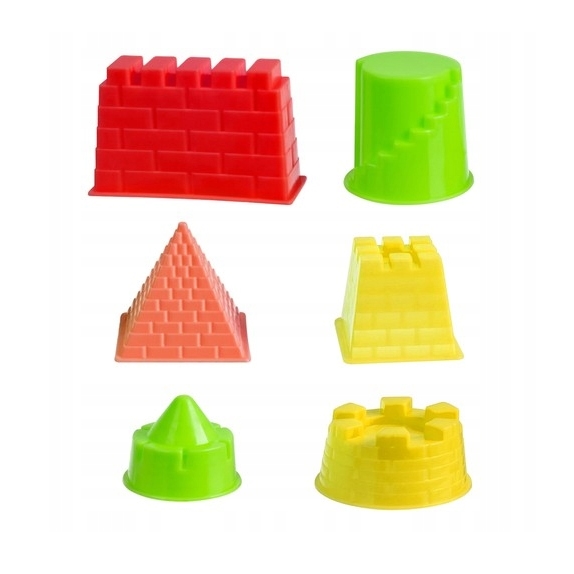 W zestawie znajdują się kolorowe foremki, dzięki którym dziecko bez trudu stworzy zamek czy zrealizują najbardziej kreatywne pomysły.