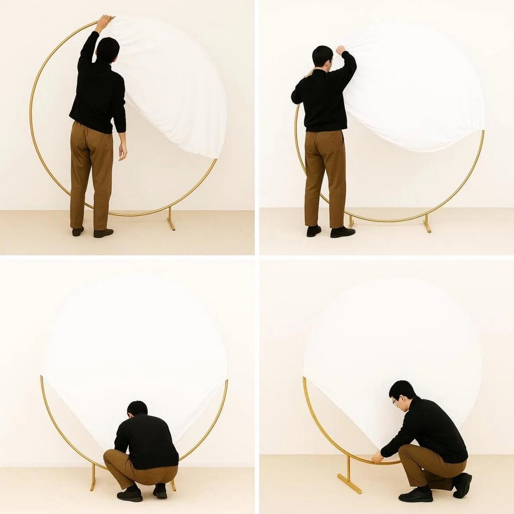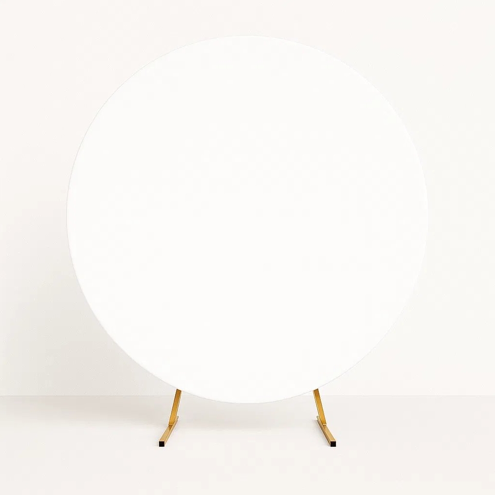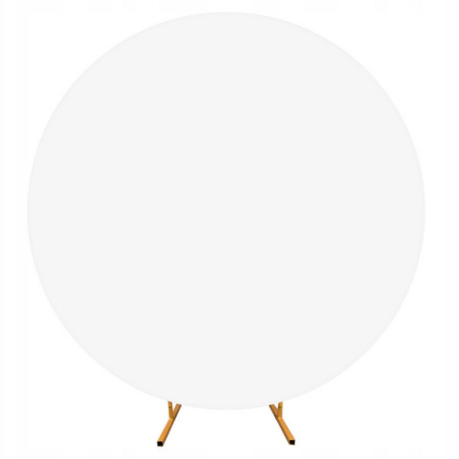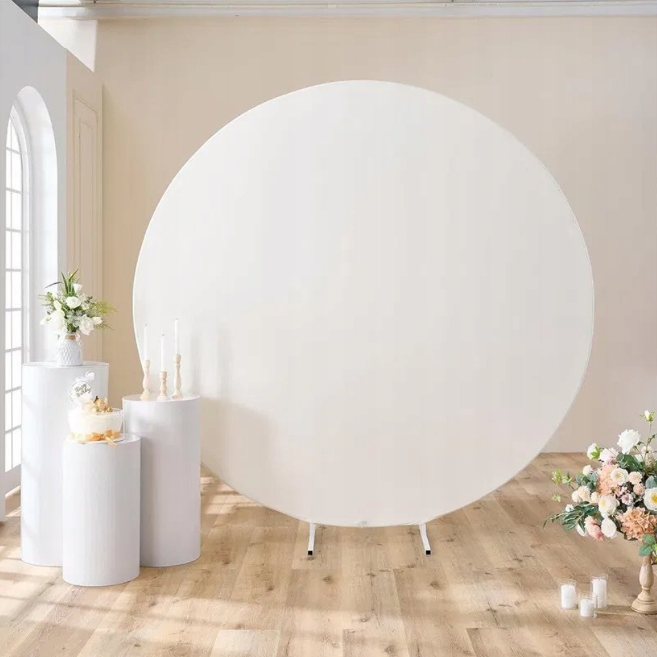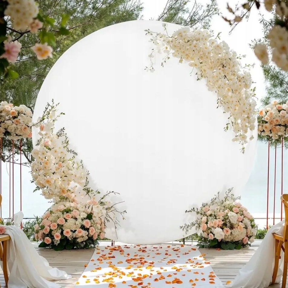 Biały pokrowiec na stojak w kształcie koła o średnicy 220cm to praktyczny element dekoracyjny, który pozwala stworzyć efektowne tło na różnego rodzaju uroczystości.