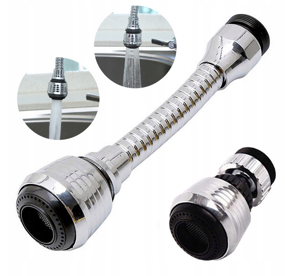 Przedłużka do kranu, pasuje do większości baterii, idealnie sprawdzi się w kuchni podczas zmywania, czyszczenia zlewu, czy mycia owoców i warzyw.