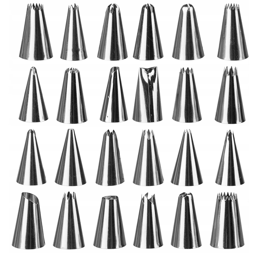 Worek cukierniczy posiada w zestawie aż 24 różne tylki, dzięki czemu z jego pomocą można łatwo i szybko wyczarować różnorodne zdobienia na deserach.