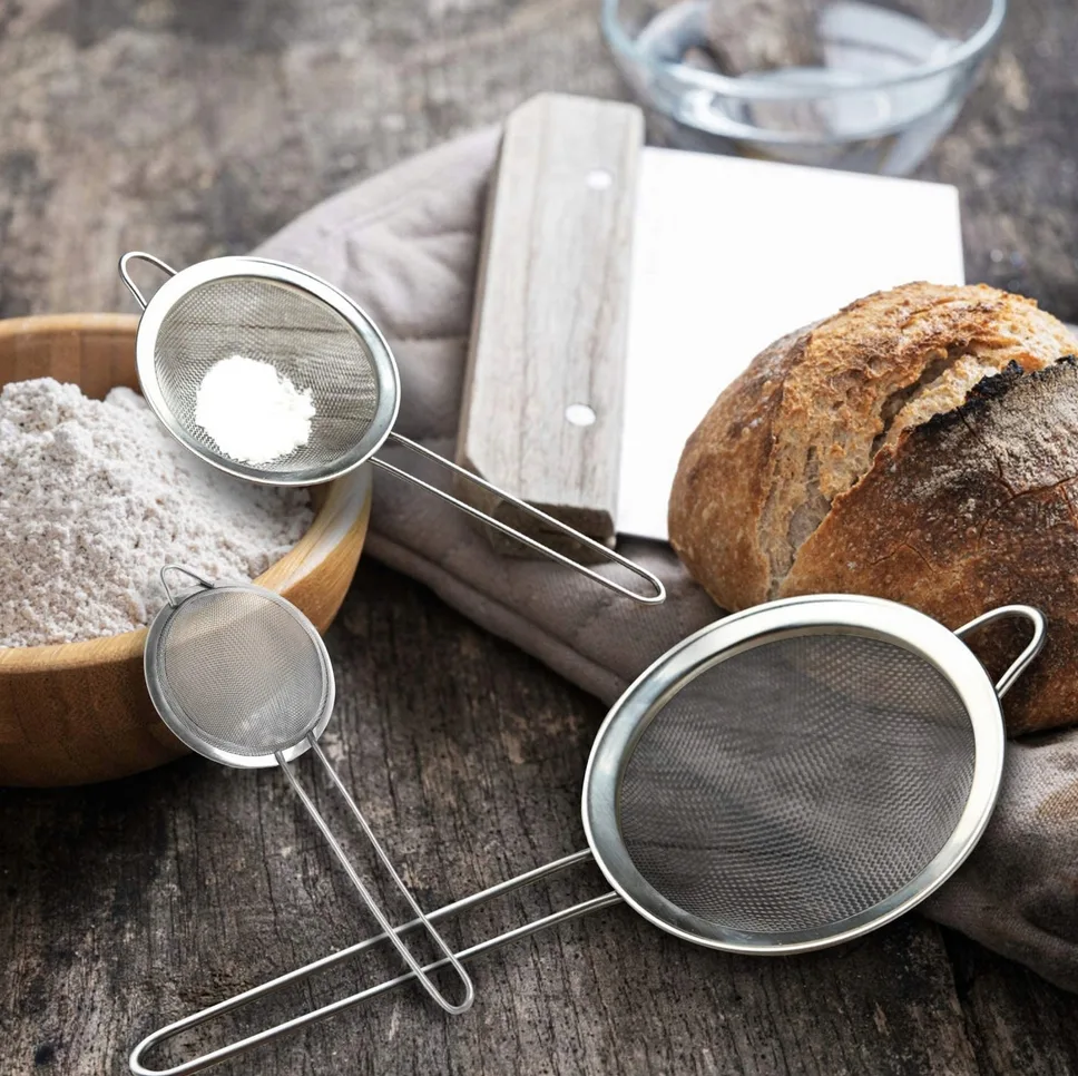 Sito kuchenne ze stali nierdzewnej służy do przesiewania mąki, cukru pudru, kakao czy innych sypkich składników w celu usunięcia grudek lub zanieczyszczeń.