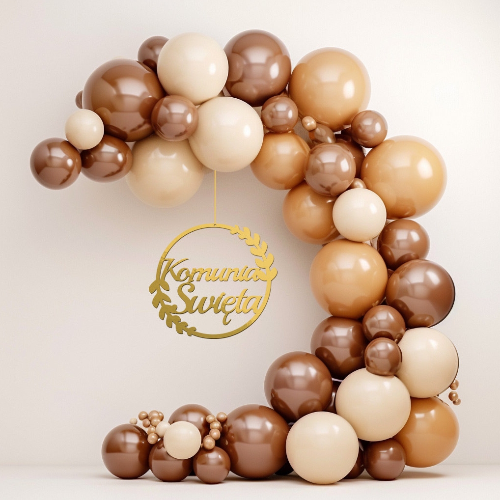 Złota zawieszka z napisem „Komunia Święta” to elegancka dekoracja, która doskonale uzupełni aranżację przyjęcia.