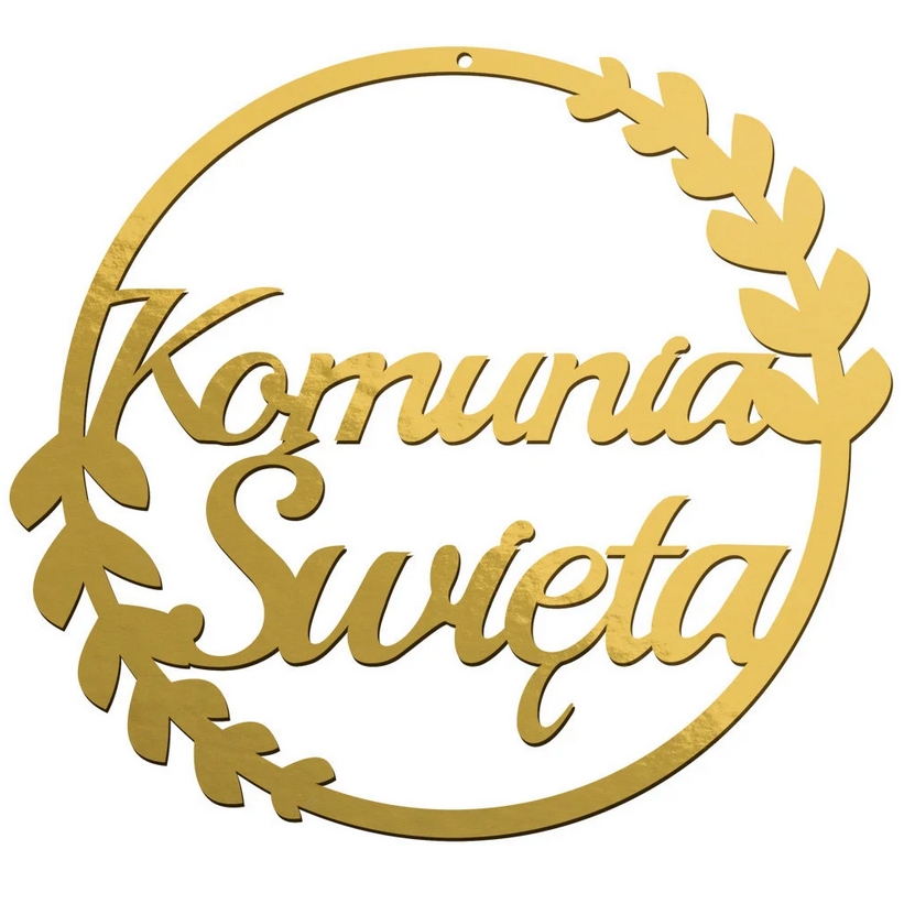 Złota zawieszka z napisem „Komunia Święta” to elegancka dekoracja, która doskonale uzupełni aranżację przyjęcia.