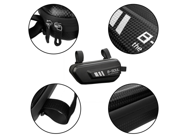 Saszetka o rozmiarach: 27 cm x 7 x cm 11,5 cm, która jest wyposażona w trzy materiałowe obręcze zapinane na rzepy. Zapewnia to stabilne mocowane oraz możliwość dopasowania do profili o różnej szerokości.