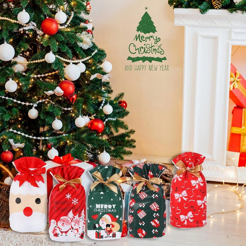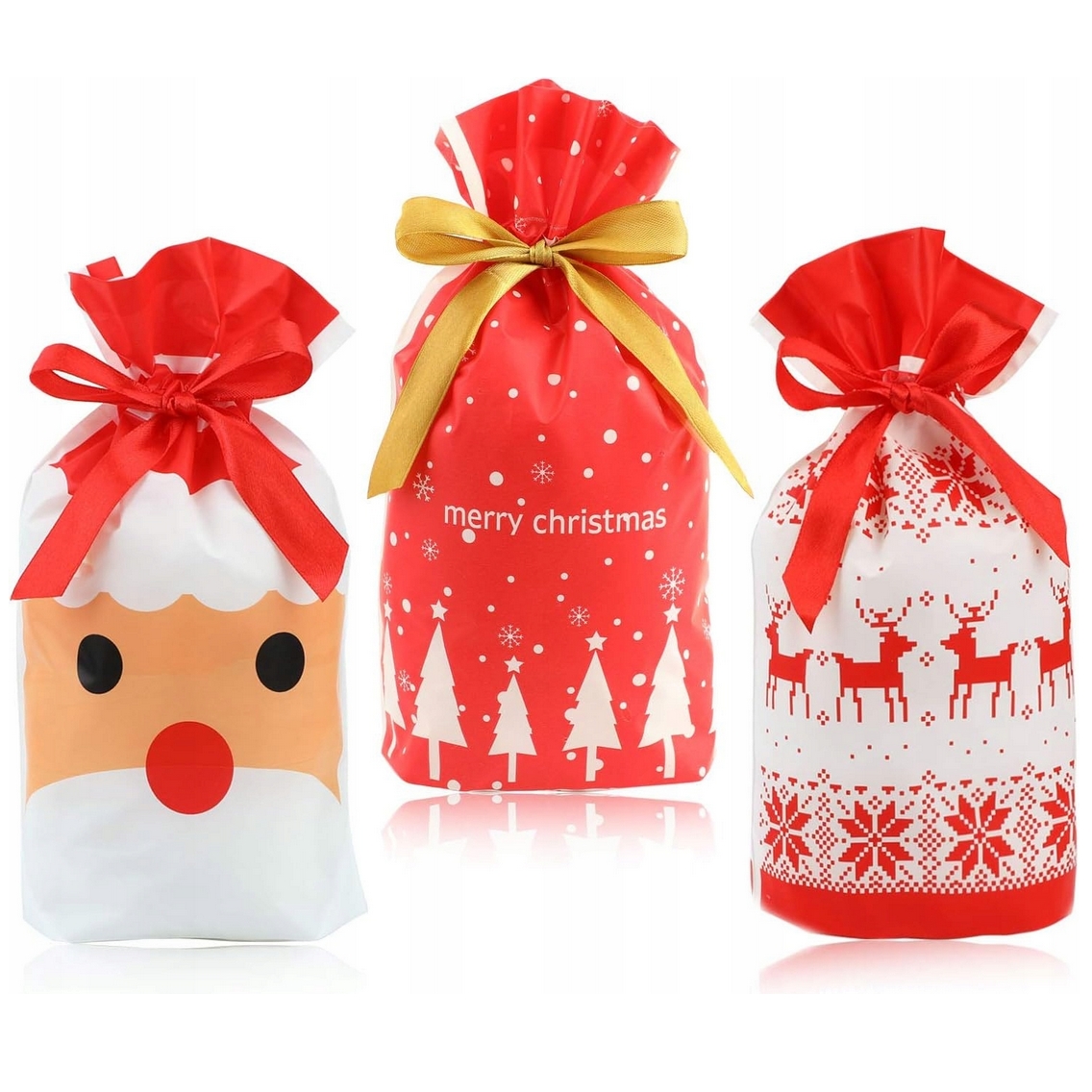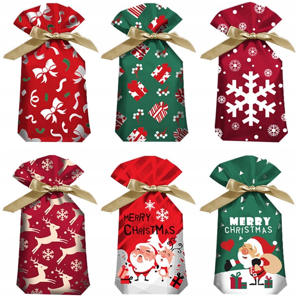 Woreczki wykonane są z trwałego materiału o świątecznych wzorach, co sprawia, że są one doskonałym uzupełnieniem każdego prezentu.