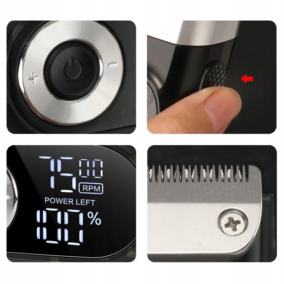 Cyfrowy wyświetlacz LED pokazuje prędkość pracy oraz poziom baterii, co pozwala w pełni kontrolować urządzenie podczas stylizacji zarostu czy strzyżenia włosów.