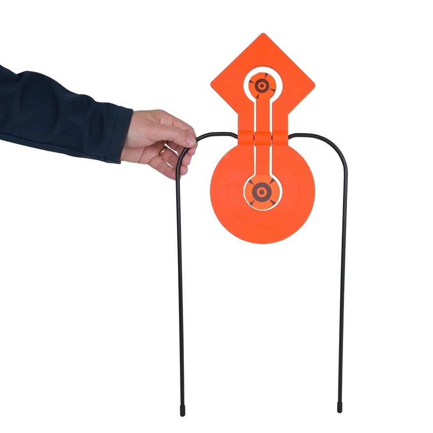System montażu oparty na szpilkach do wbijania w podłoże umożliwia szybkie i stabilne ustawienie celu bez użycia narzędzi.