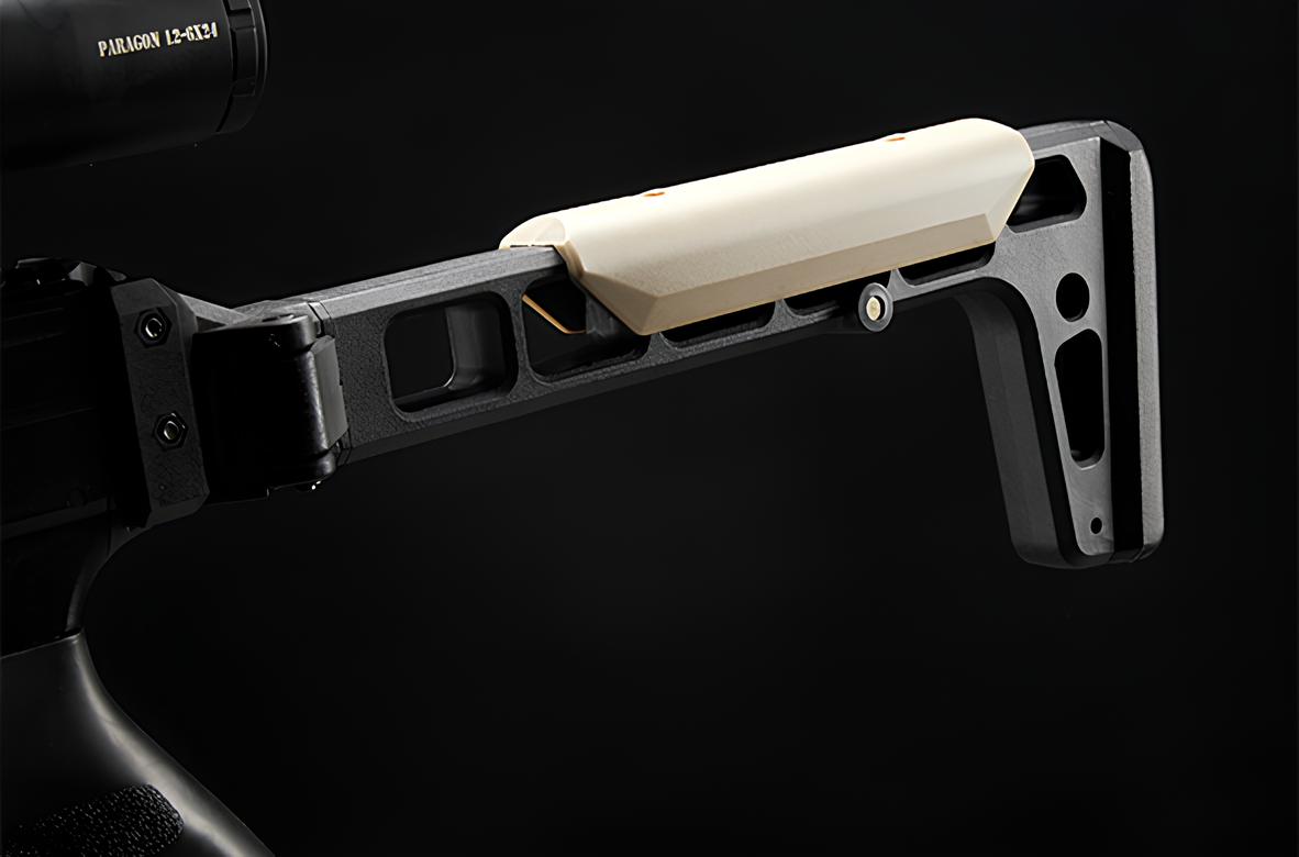 Składana, demontowalna kolba skraca całkowitą długość karabinka, co ułatwia jego przenoszenie i użytkowanie w terenie.