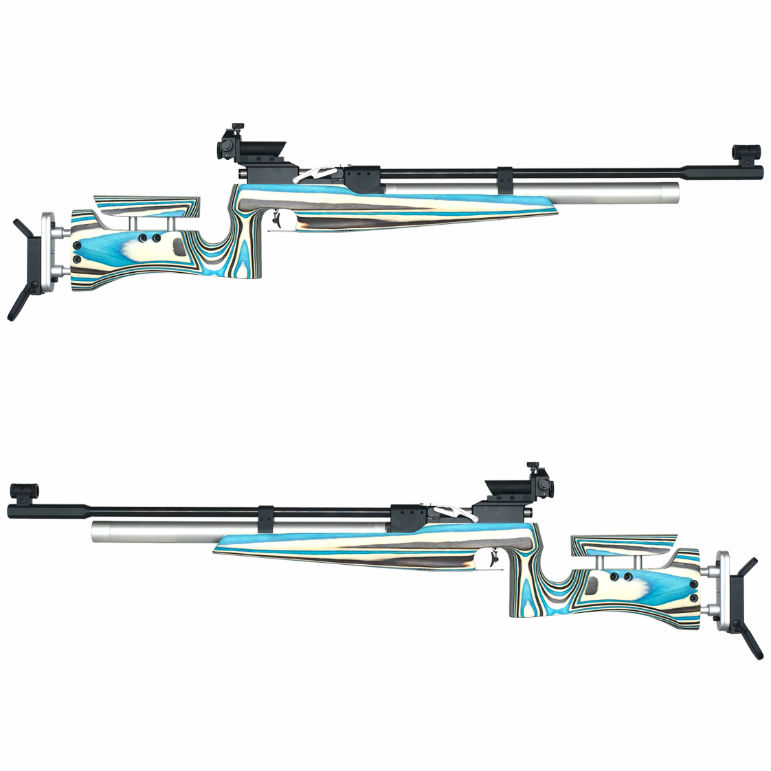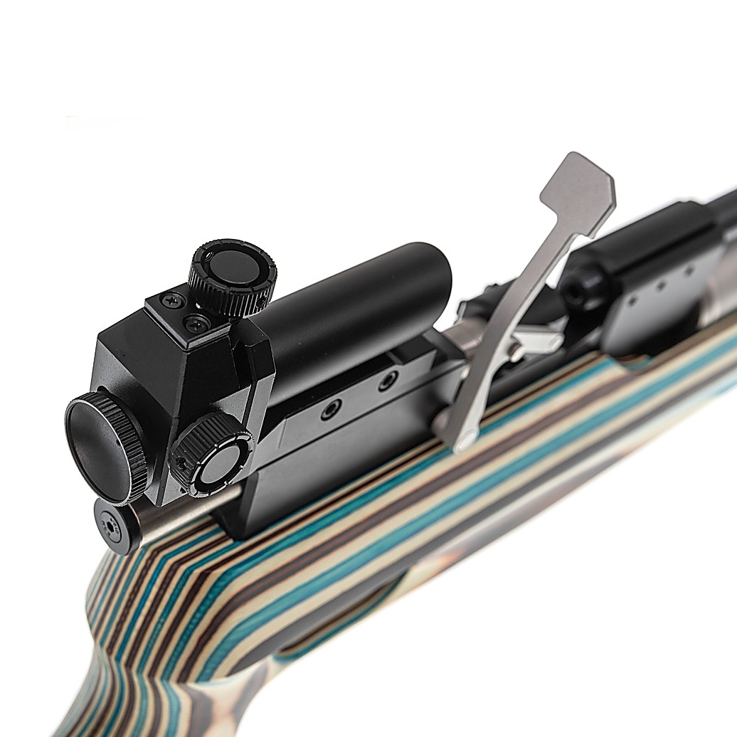 Przyrządy celownicze, w tym regulowany diopter, zamontowano na szynie 11 mm, co umożliwia ich łatwe przesuwanie lub wymianę.
