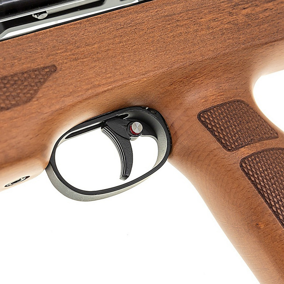 Ergonomiczna kolba z drewna bukowego posiada otwór na kciuk, teksturowany chwyt pistoletowy oraz podwyższoną bakę policzkową ułatwiającą korzystanie z lunety.