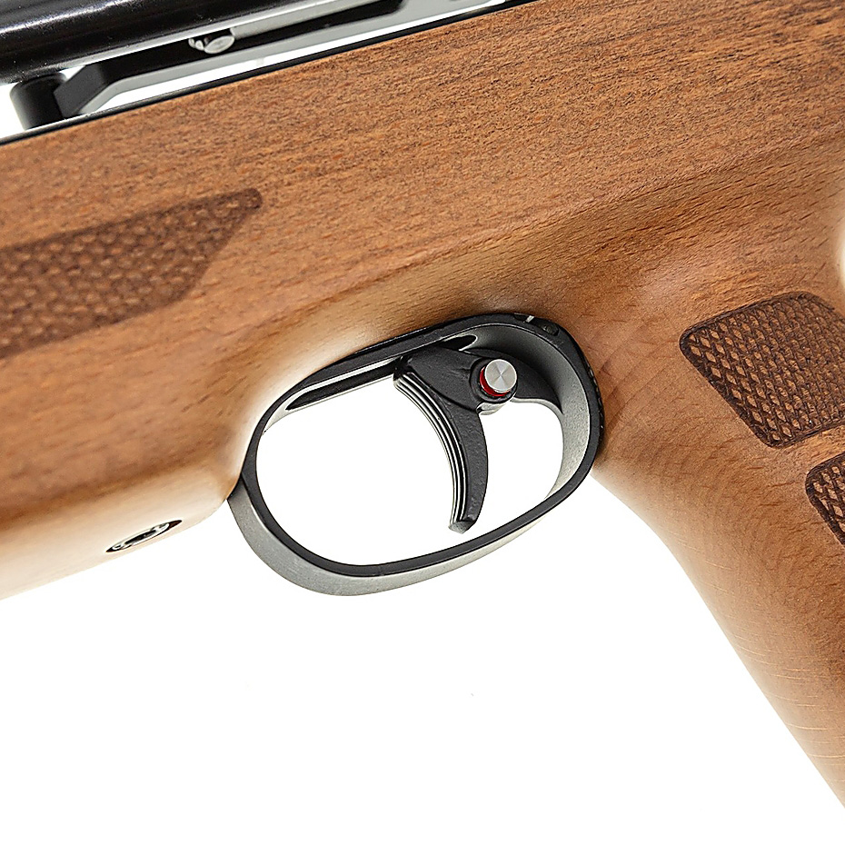 Ergonomiczna kolba z drewna bukowego posiada otwór na kciuk, teksturowany chwyt pistoletowy oraz podwyższoną bakę policzkową ułatwiającą korzystanie z lunety.