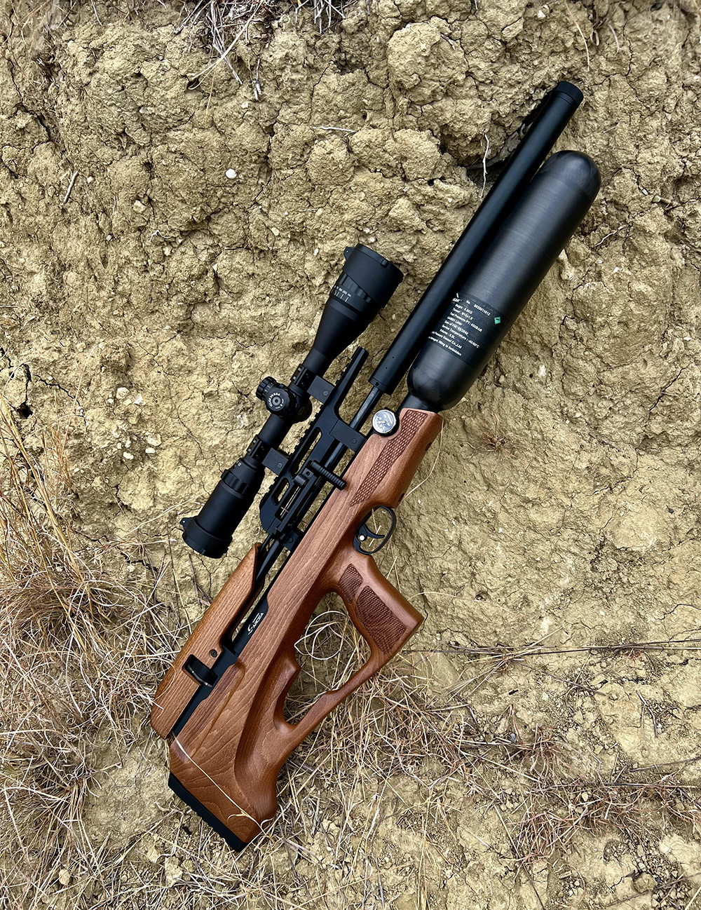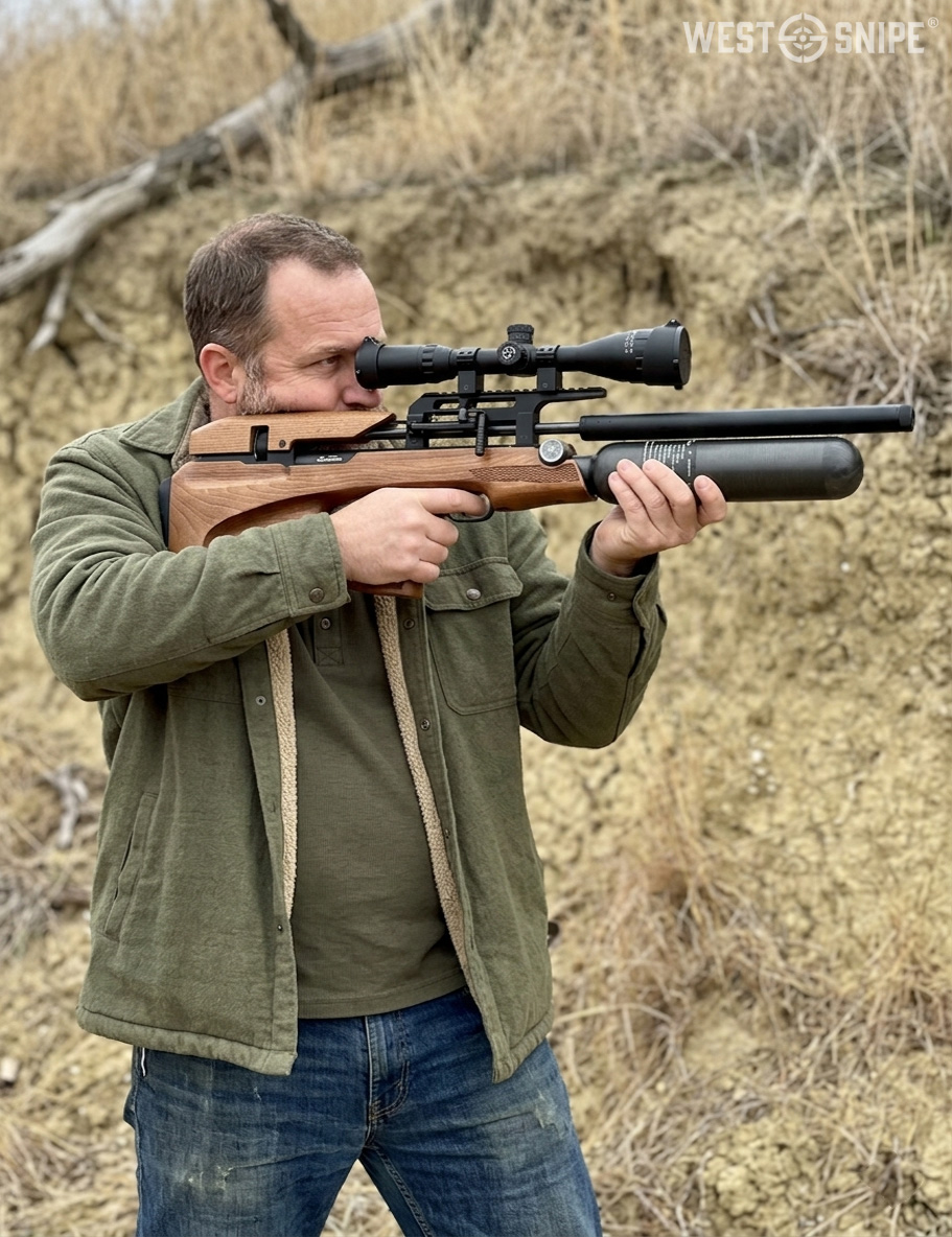WESTSNIPE® P35X-TB to nowoczesna, kompaktowa wiatrówka PCP w układzie bullpup, która łączy wysoką energię strzału z precyzją, klasycznym wyglądem drewnianej kolby typu thumbhole oraz powiększonym zbiorniku na spreżone powietrze.