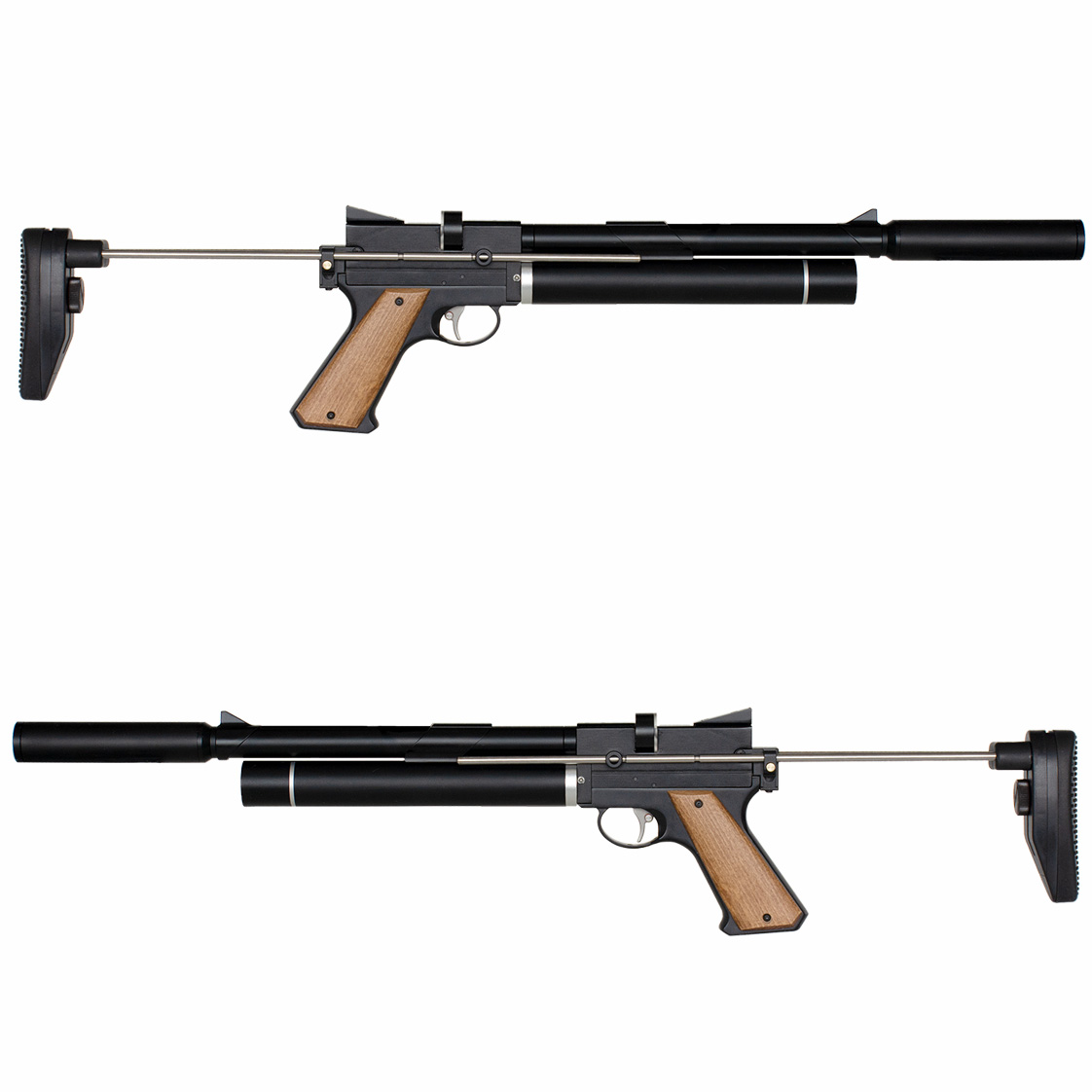 Pistolet wyposażono w zdejmowaną kolbę teleskopową z regulacją długości i kąta nachylenia oraz regulowaną gumową stopkę.