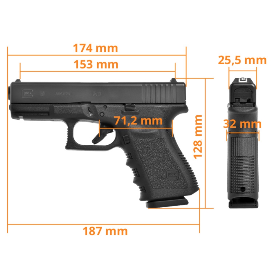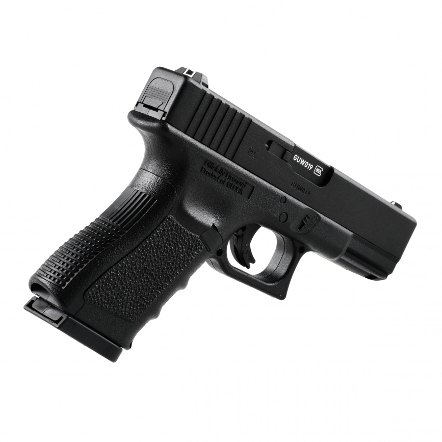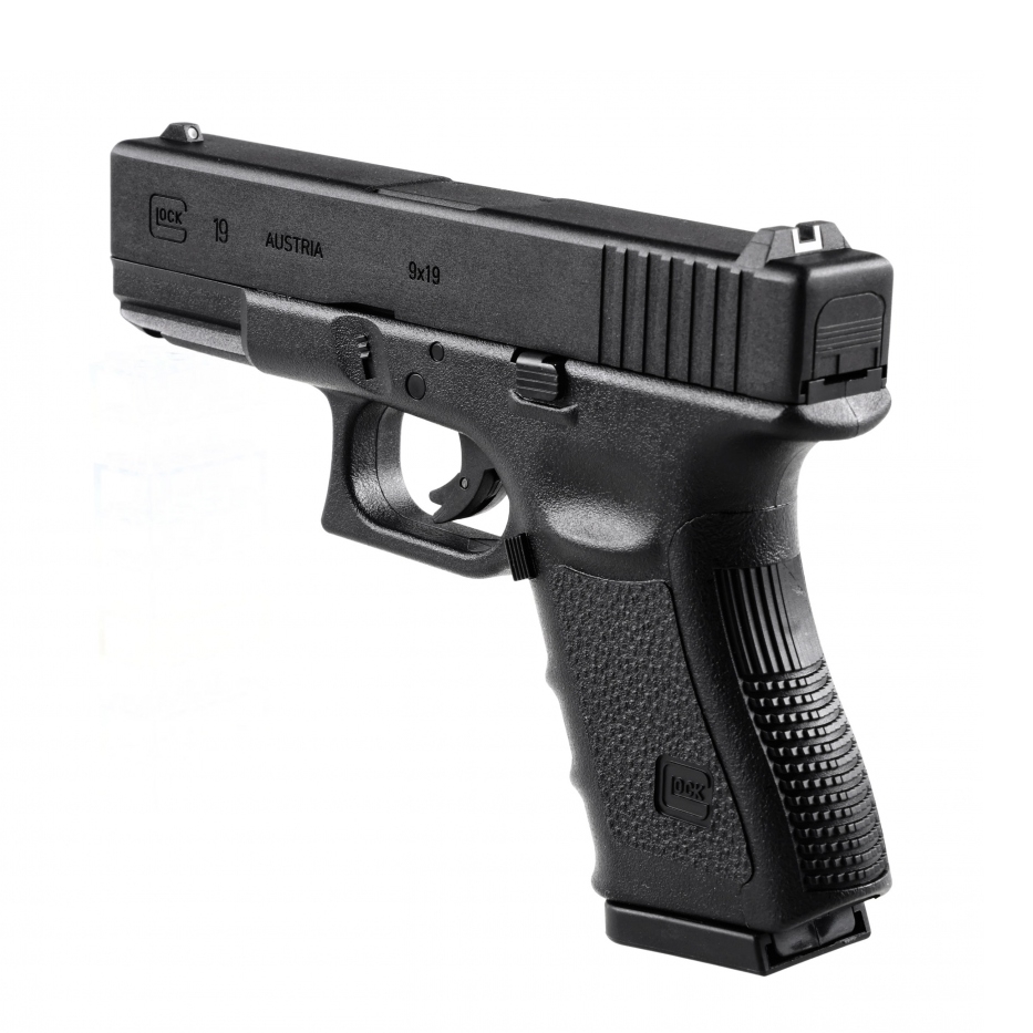 Glock 19 4,5 mm BB CO2 to pistolet pneumatyczny na CO2, wyposażony w metalowy zamek, wysuwany z rękojeści magazynek oraz szereg rozwiązań konstrukcyjnych zapożyczonych z broni palnej.