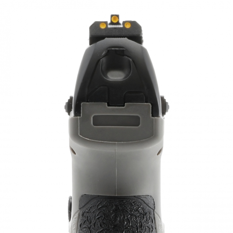 Pistolet jest przeznaczony do strzelania dynamicznego, dlatego na mechanicznych przyrządach celowniczych naniesiono żółte kropki, ułatwiające zgrywanie muszki i szczerbinki na celu.