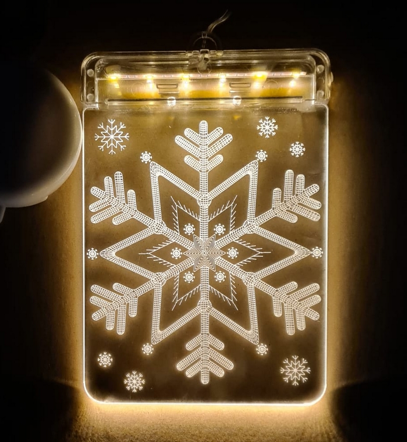 Prostokątny witraż LED przedstawiający śnieżynkę.